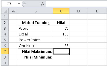 Sebagai contoh, pada tabel berikut ini ditanyakan berapa nilai maksimum dan minimum untuk semua nilai yang ada, yaitu data nilai pada sel C3 hingga C6.