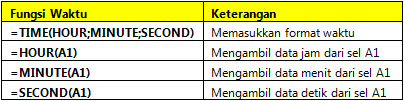DAPMKUSANHILIR.OR.ID – Selain Fungsi Tanggal, Excel juga menyediakan beragam fungsi untuk menghitung waktu atau jam. Beberapa Fungsi Waktu yang umum digunakan berikut aturan penulisannya dapat dilihat pada tabel berikut ini.