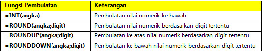 Ada 4 varian fungsi pembulatan yang umum digunakan, yaitu INT, ROUND, ROUNDUP, dan ROUNDDOWN. Perbedaan fungsi-fungsi tersebut berikut aturan penulisannya bisa dilihat pada tabel berikut ini.