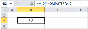 Maka hasilnya sel B2 tersebut akan menampilkan kata PU, yaitu 2 karakter yang dihitung mulai karakter ke-4 pada kata KOMPUTER seperti tampak pada gambar berikut ini.