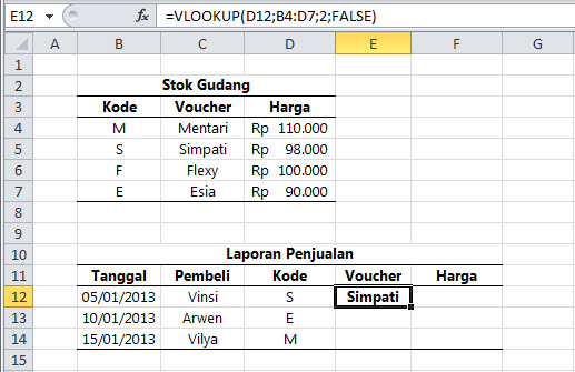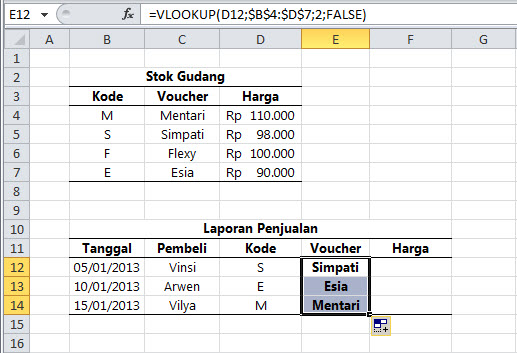 Pada contoh tersebut terdapat 2 buah tabel. Data pada tabel Laporan Penjualan jelas akan selalu bertambah tiap harinya. Setiap kali ada pembeli maka Anda tinggal mengisikan data tanggal, nama pembeli serta kode voucher-nya. Sementara data Voucher serta Harga akan terisi secara otomatis tiap kali Anda mengisikan data pada kolom Kode. Pengisian data secara otomatis ini bisa dicapai dengan melihat tabel referensi yaitu tabel Stok Gudang dan tentunya dengan menggunakan formula VLOOKUP.
