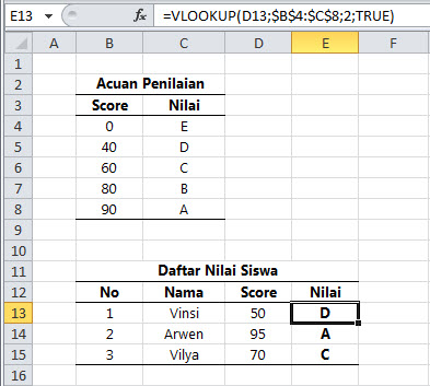 Anda harus mengisikan formula VLOOKUP pada kolom Nilai dalam tabel Daftar Nilai Siswa, yaitu sel E13 hingga sel E15. Nilai yang akan diisikan tersebut mengacu pada range tertentu dalam tabel referensi, yaitu: